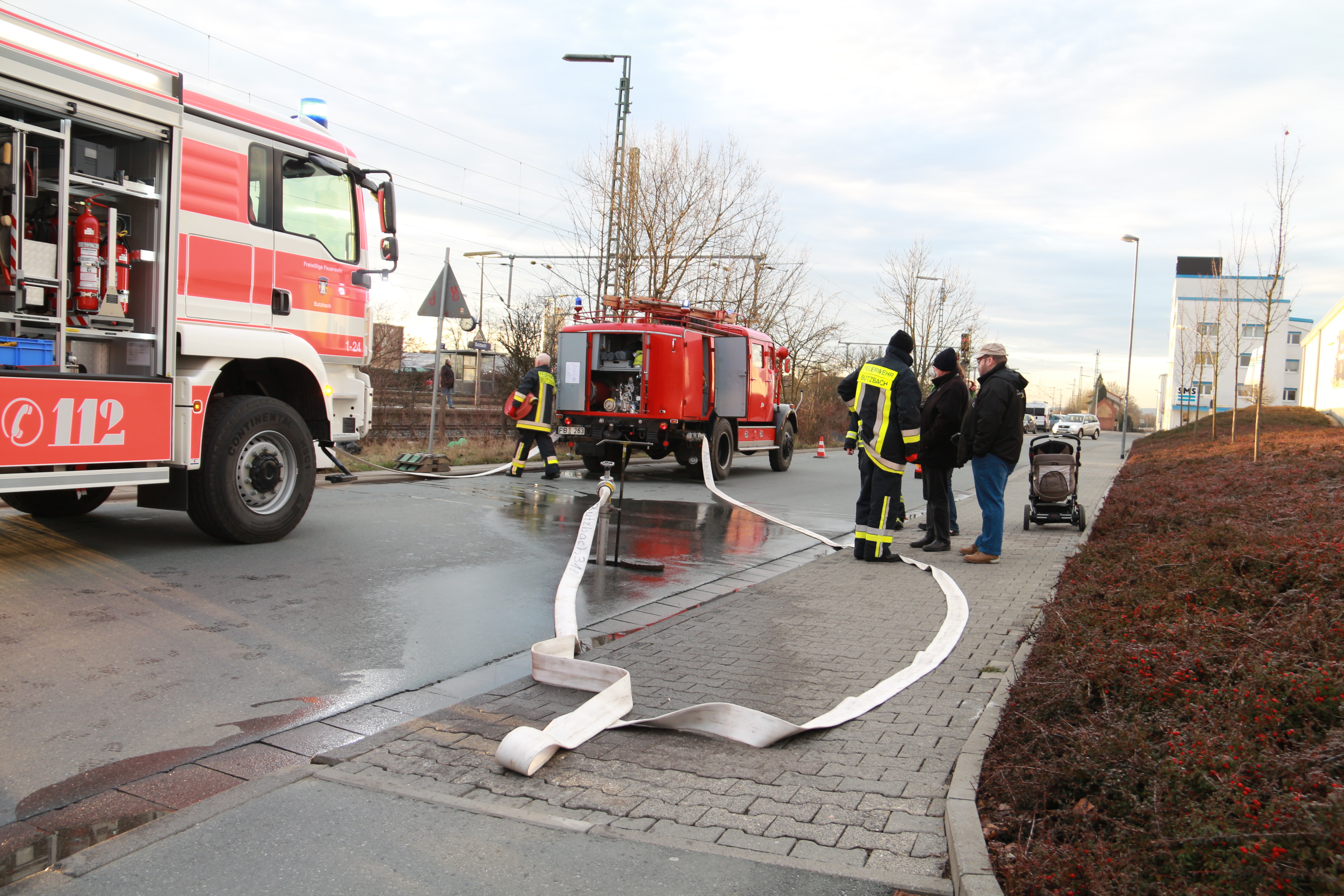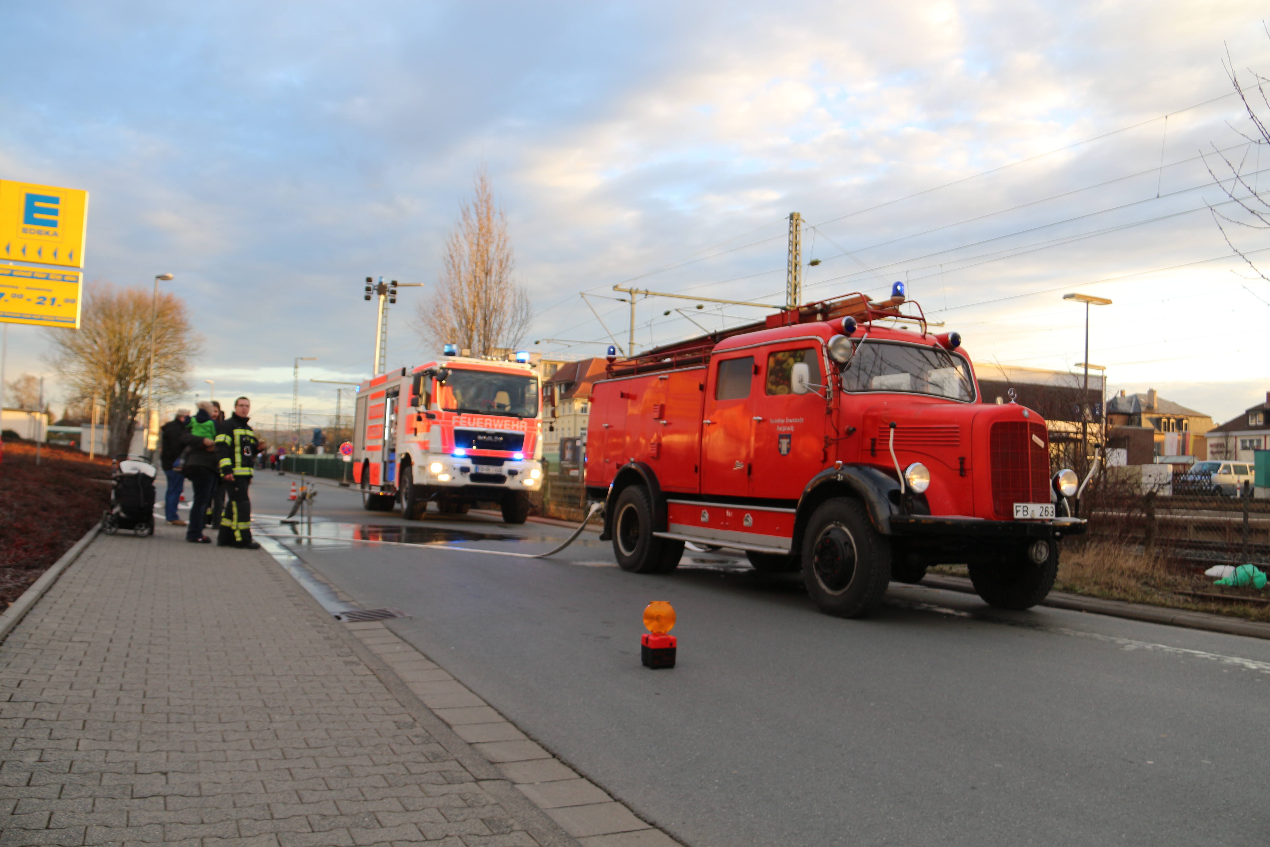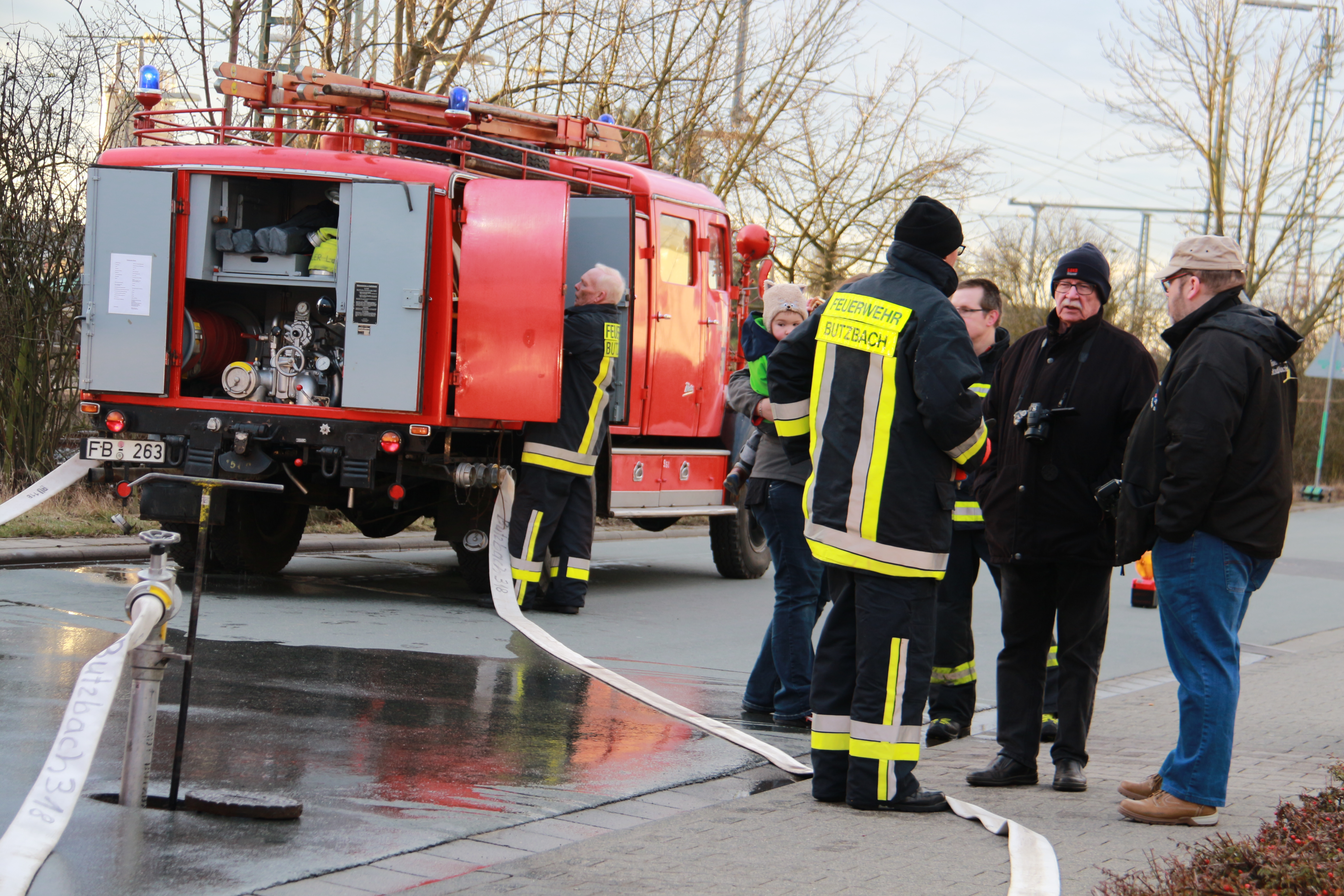 Punktgenau auf Höhe der beiden Tanklöschfahrzeuge, welche auf der Kaiserstraße Aufstellung genommen hatten, kam die Dampflok zum Stehen. Routiniert wurden die Schläuche an die Lok und an den dahinter befindlichen Wasserkesselwagen angekuppelt und dann hieß es „Wasser marsch“.