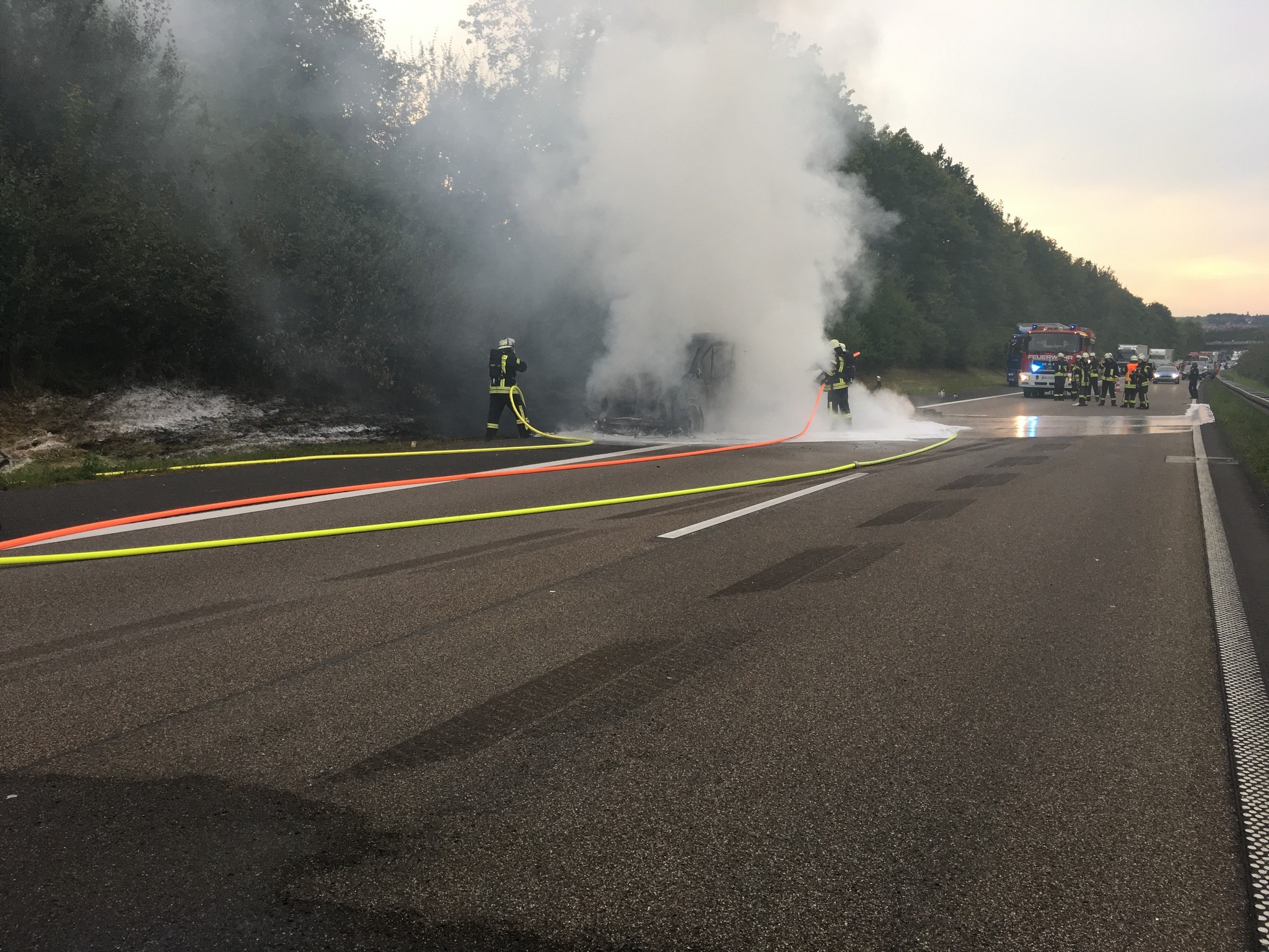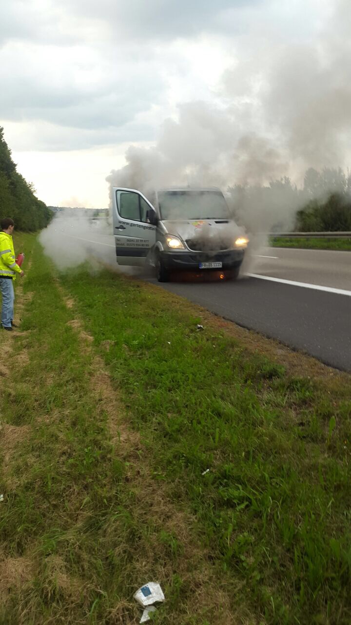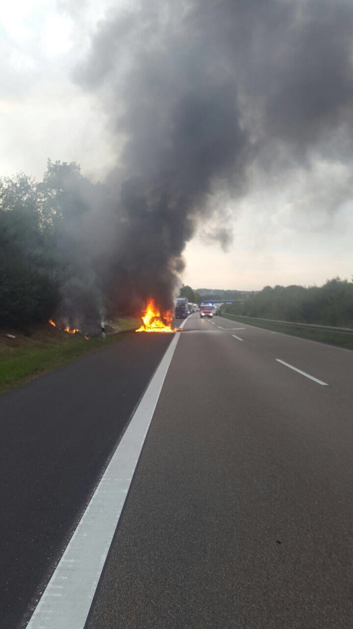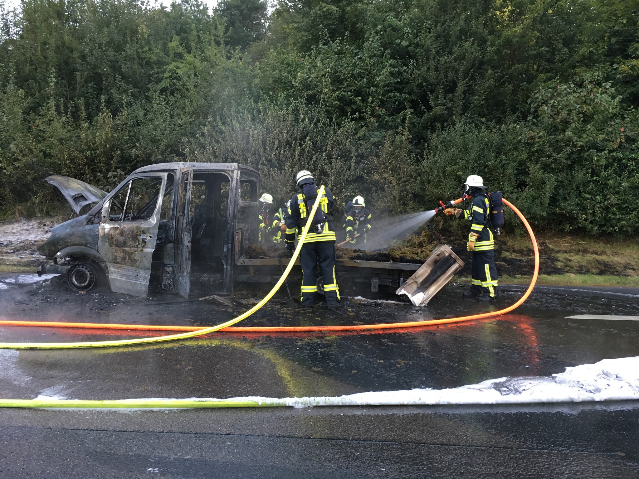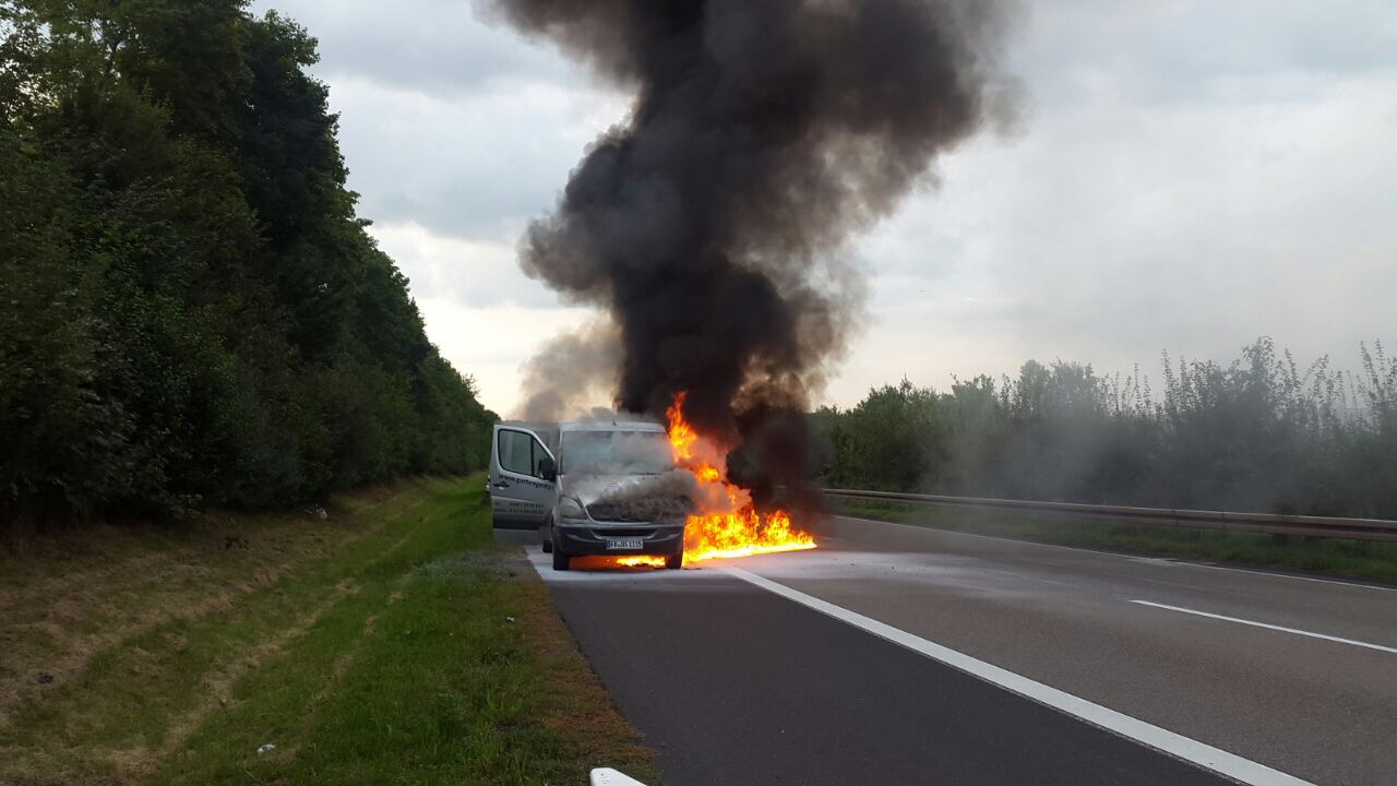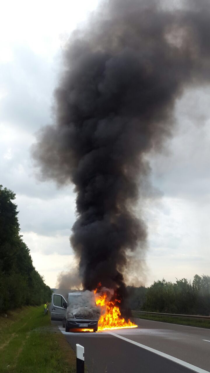 Ein Pritschenfahrzeug war aus ungeklärter Ursache in Brand geraten. Der Fahrer konnte das Fahrzeug noch auf den Standstreifen lenken und langsam ausrollen lassen, da die Bremsen bereits ihren Dienst aufgegeben hatten. Zum Glück konnten er und seine Beifahrerin das Fahrzeug unverletzt verlassen, bevor es gänzlich im Vollbrand stand.