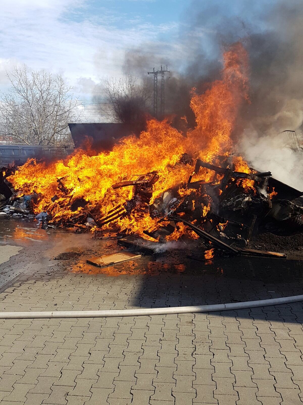 Bei Eintreffen der Einsatzkräfte stand die Presse im Vollbrand. Der brennende Inhalt wurde mit Hilfe eines Baggers ausgekippt und von der Feuerwehr abgelöscht.