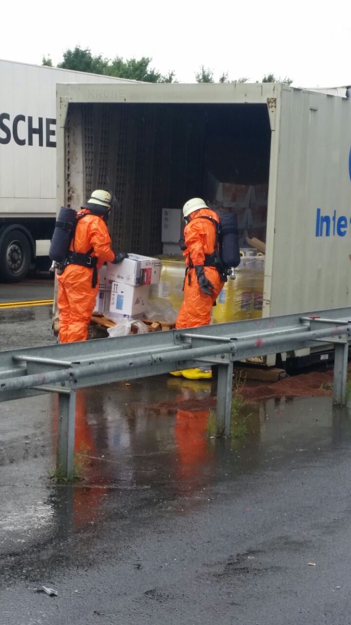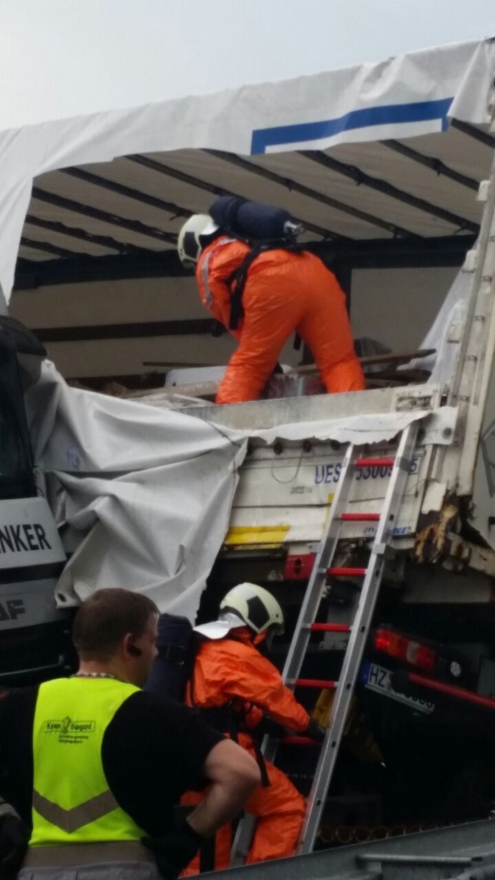 Da die LKW ineinander verkeilt waren, gestaltete sich die Bergung der Ladung schwierig. Diese Arbeiten wurden unter Vollschutz verrichtet, weswegen weitere Atemschutzgeräteträger an die Einsatzstelle beordert wurden.