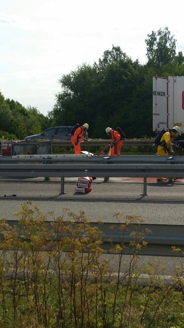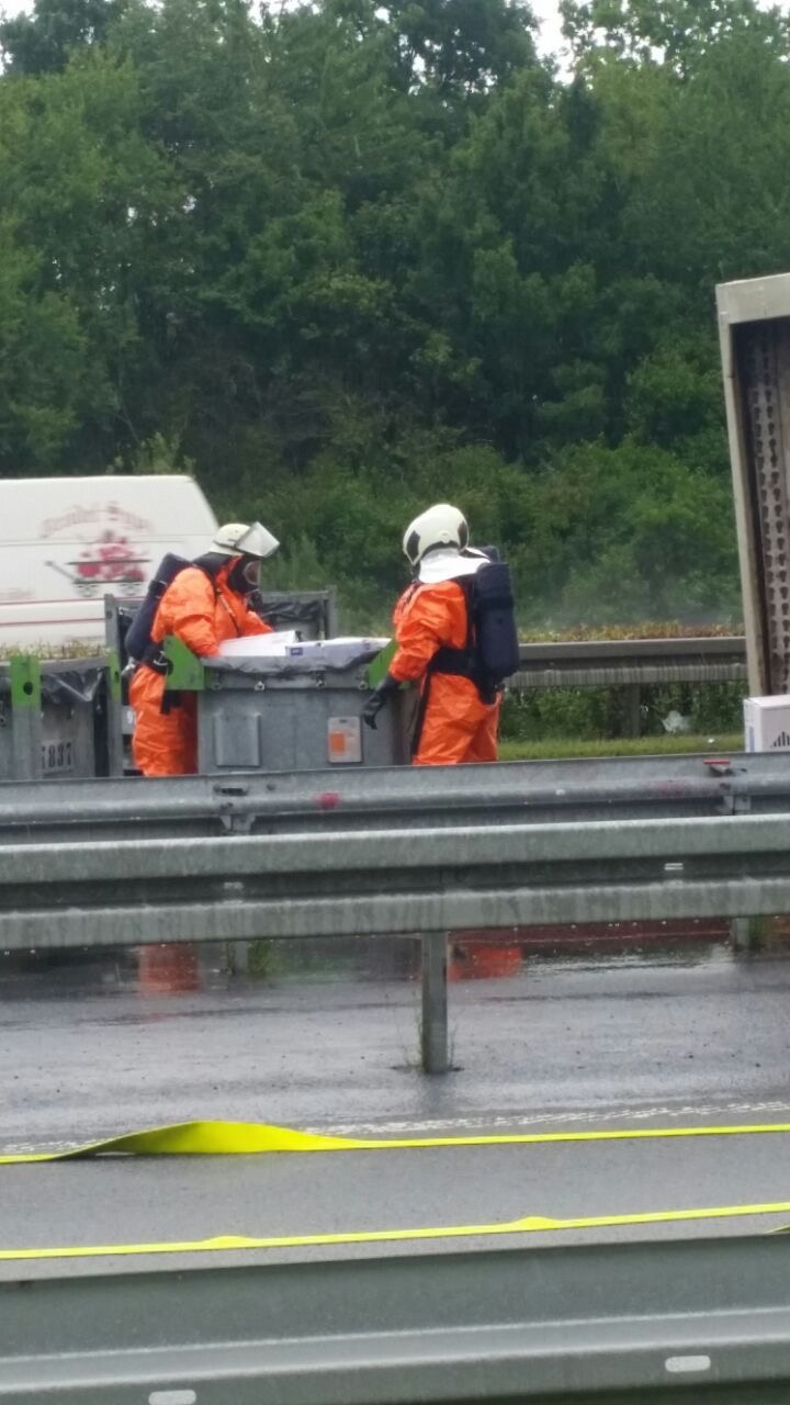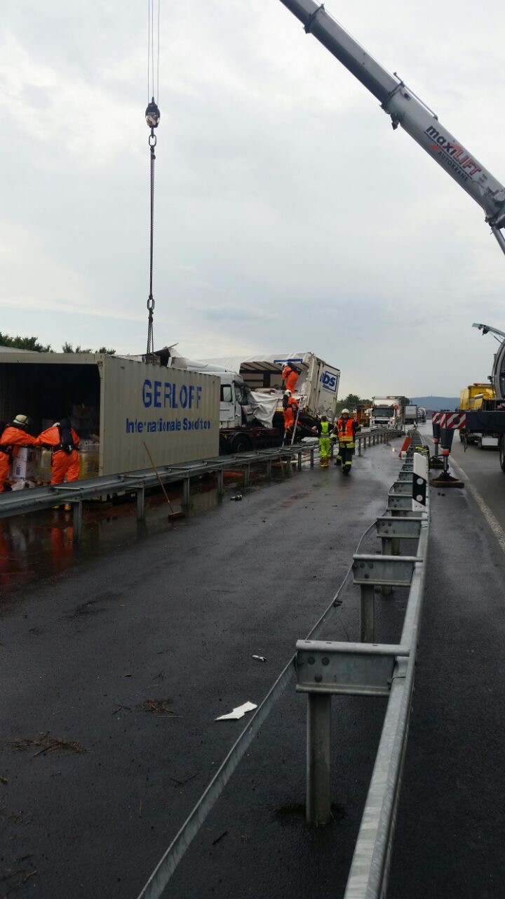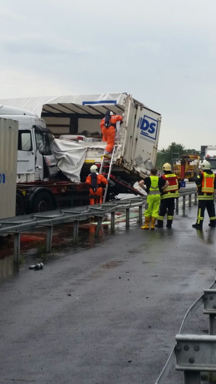 Einer der beiden LKW hatte Gefahrgut an Bord, die Ladung wurde durch den Aufprall beschädigt und fiel auf die Fahrbahn.