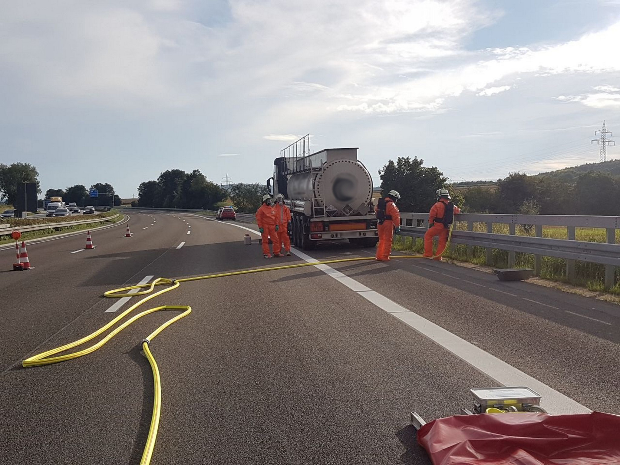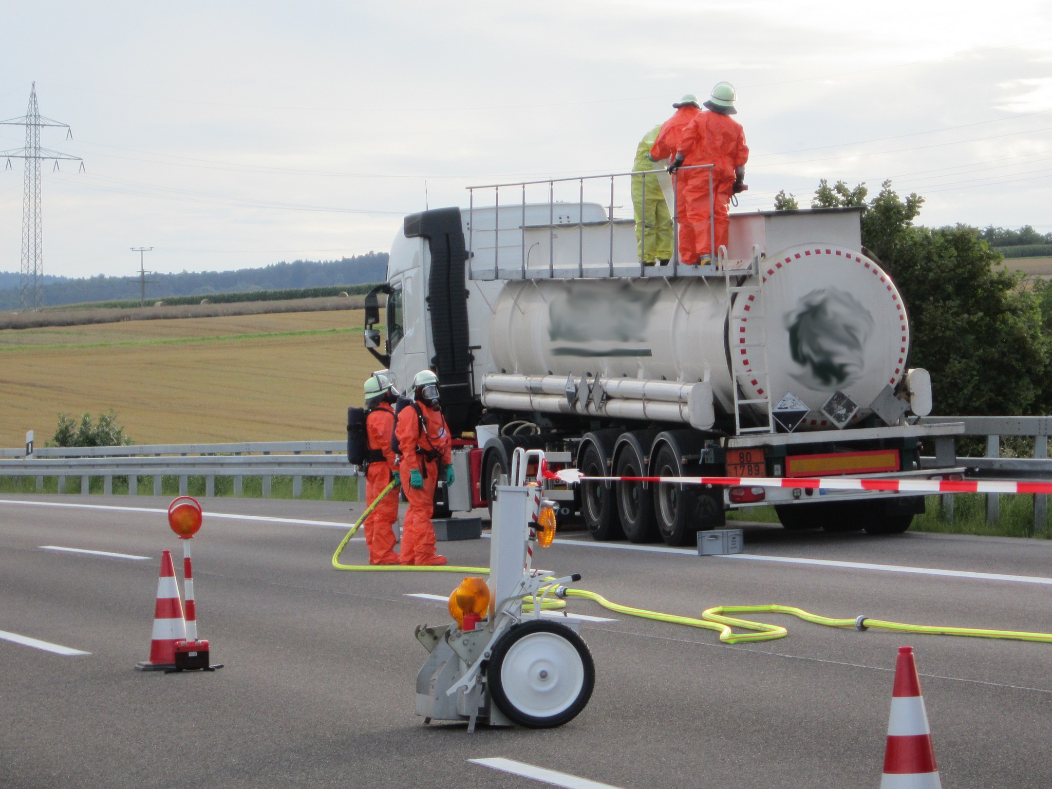 Ein LKW befuhr die A5 in Richtung Frankfurt, als er einen lauten Knall hörte. Ein zunächst angenommener geplatzter Reifen konnte durch den Fahrer nicht festgestellt werden, jedoch sah der Lenker, dass aus der oberen Öffnung Gefahrgut, in diesem Fall Salzsäure, ausgetreten war. Er reagierte sofort, streute den auslaufenden Stoff ab und informierte die Polizei, die wiederum die Feuerwehr alarmierte.