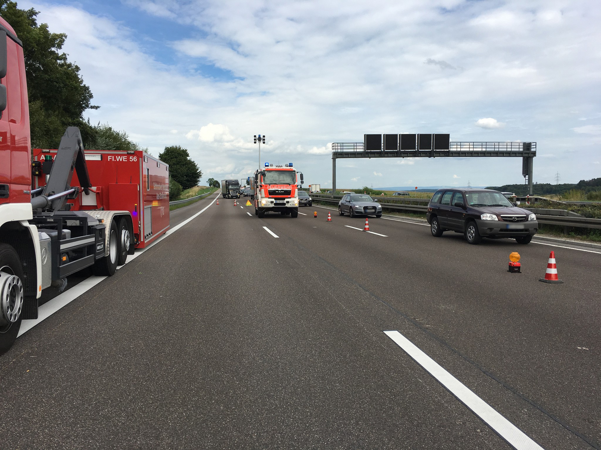 Schnell waren die Kräfte vor Ort und machten sich ein erstes Bild der Einsatzstelle und des Umfangs. Es wurde gemäß den Vorschriften ein Sicherheitsbereich eingerichtet. Die A5 musste deshalb voll gesperrt werden, um vorbeifahrende Personen nicht zu gefährden.