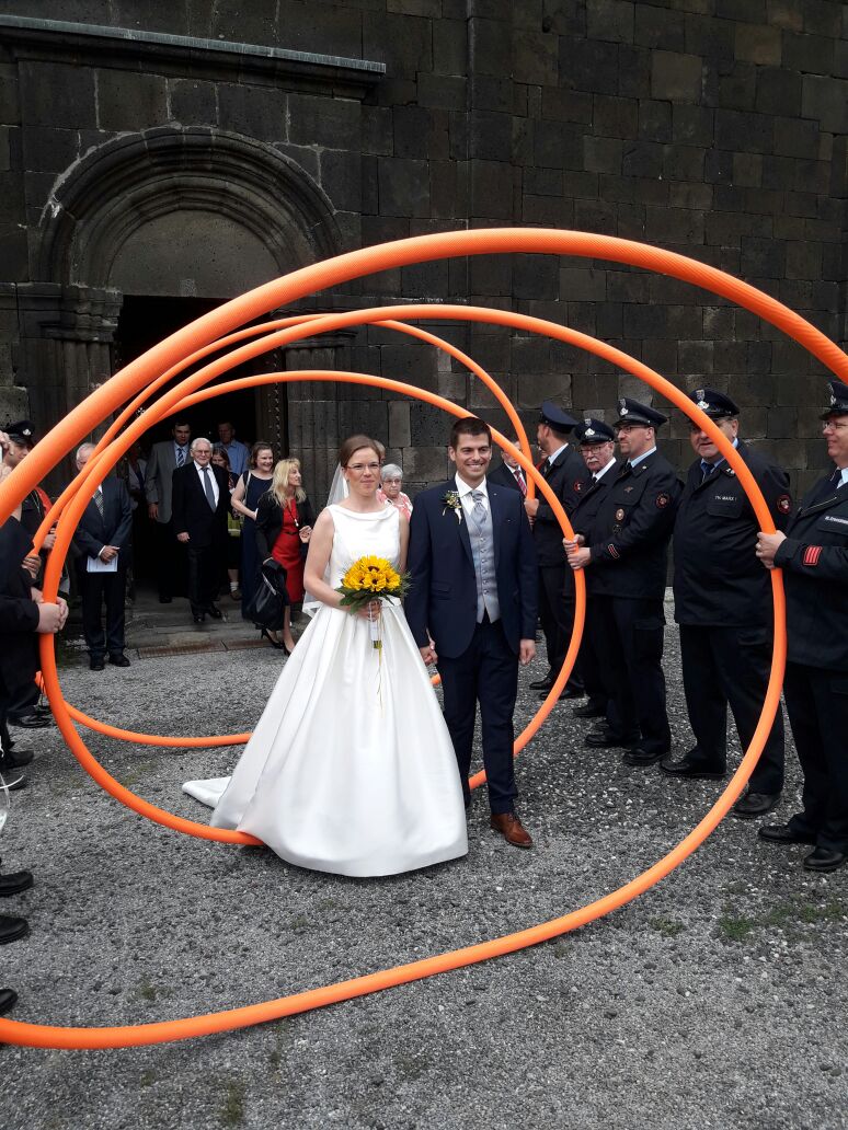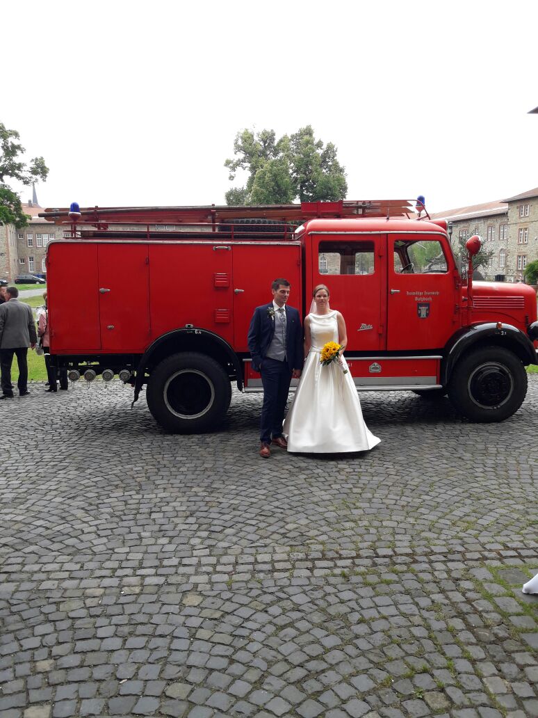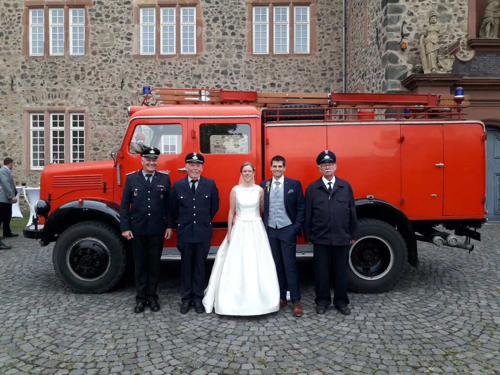 Rüdiger ist aktiver Feuerwehrmann in Nieder Weisel und der Kernstadt und so war es standesgemäß, dass er und seine Frau in einem Feuerwehrauto chauffiert wurden.