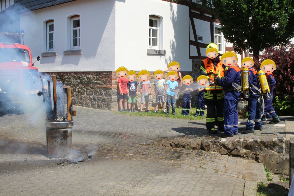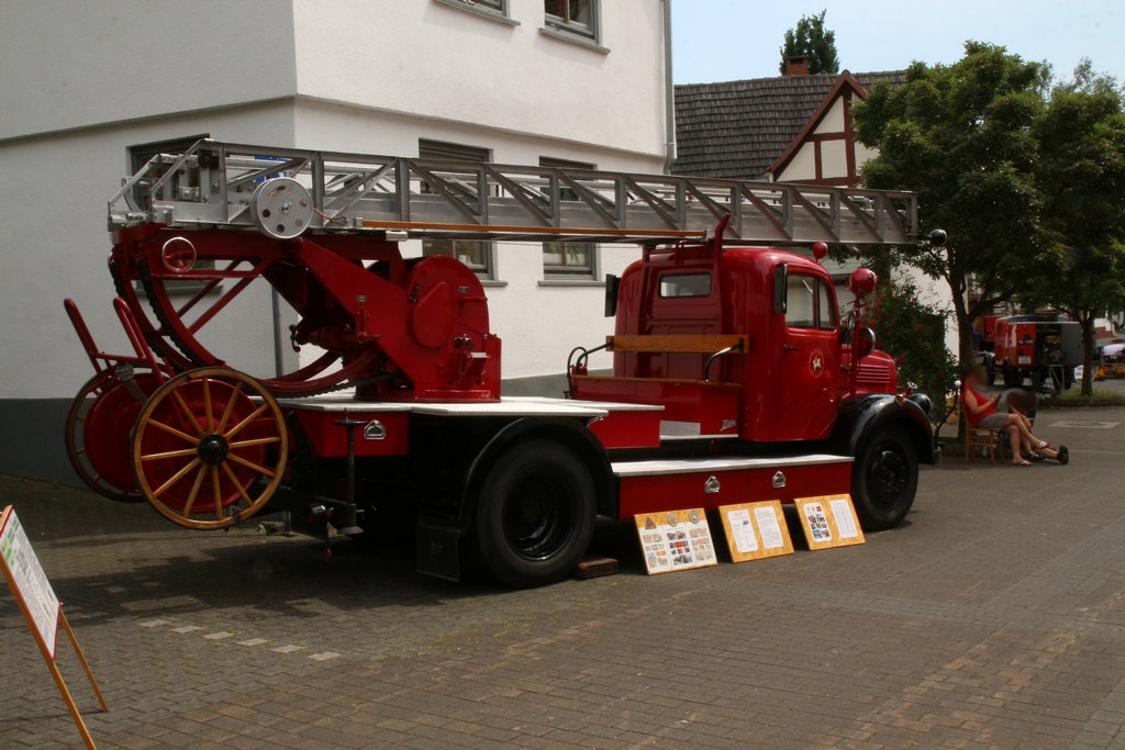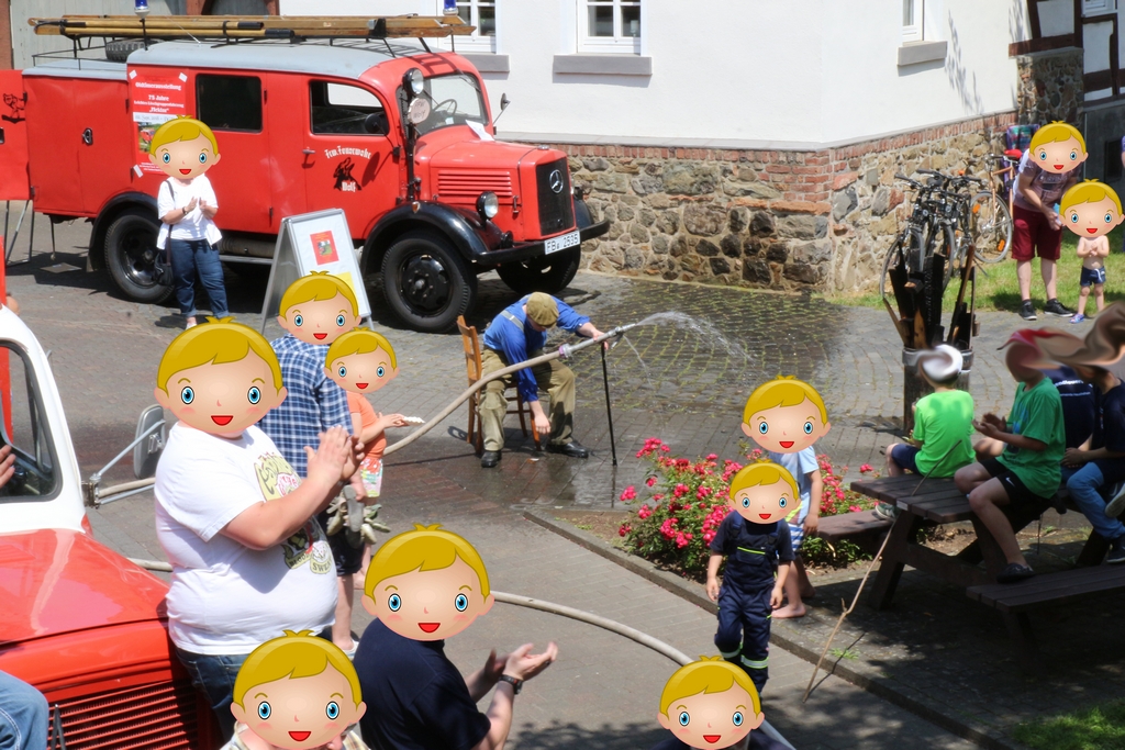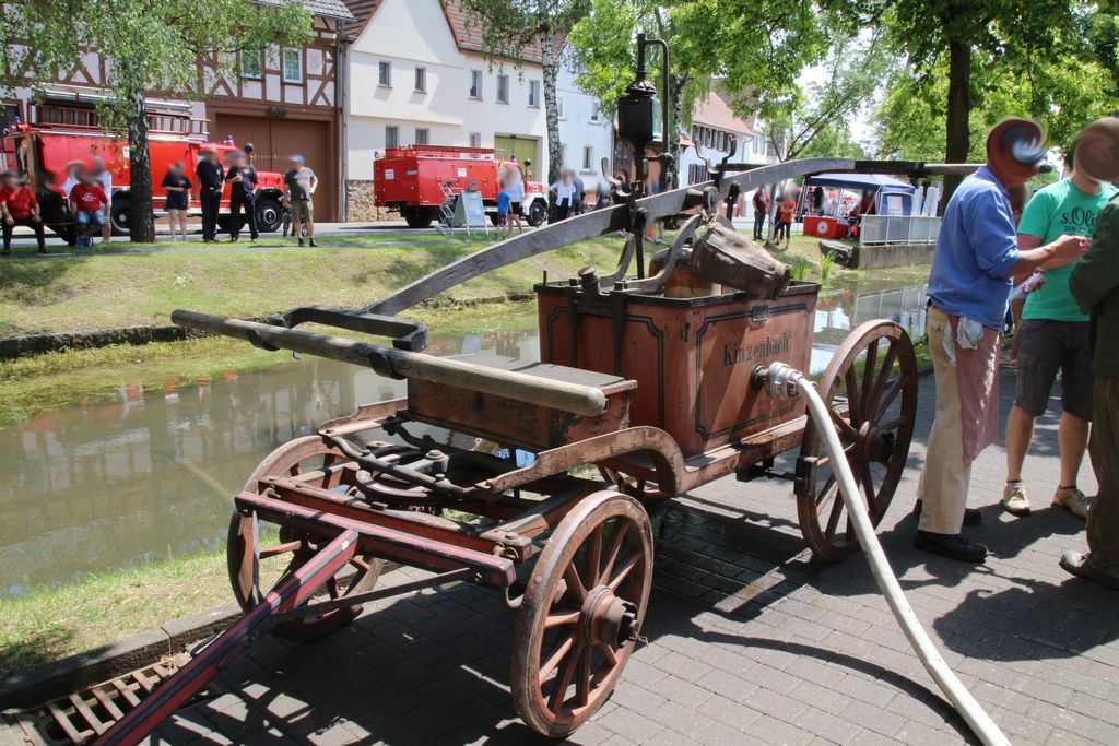 Geboten wurde zudem ein abwechslungsreiches Programm. Die Jugendfeuerwehr Heuchelheim führte einen Löschangriff vor und zeigt, was sie bereits können. Einen Löschangriff der besonderen Art zeigte die Einsatzabteilung: „löschen im Jahre 18..“. Mit der noch nie umgebauten oder instandgesetzten, handgezogene Spritze kamen die Männer in Kleidung der damaligen Zeit um die Ecke, um einen Stapel Holz abzulöschen. „Opa“ mit dem Strahlrohr voran bekam einen Stuhl hin gestellt, um sich beim Löschen nicht zu verausgaben. Das Pumpen des Wassers aus dem Flüsschen Bieber war anstrengend, sodass Hilfe aus der Bevölkerung gerne angenommen wurde. Nach dem „Feuer aus“ gab es noch „Löschwasser“ in Form von selbstgebranntem Schnaps, für alle Helfer und Wehrleute.