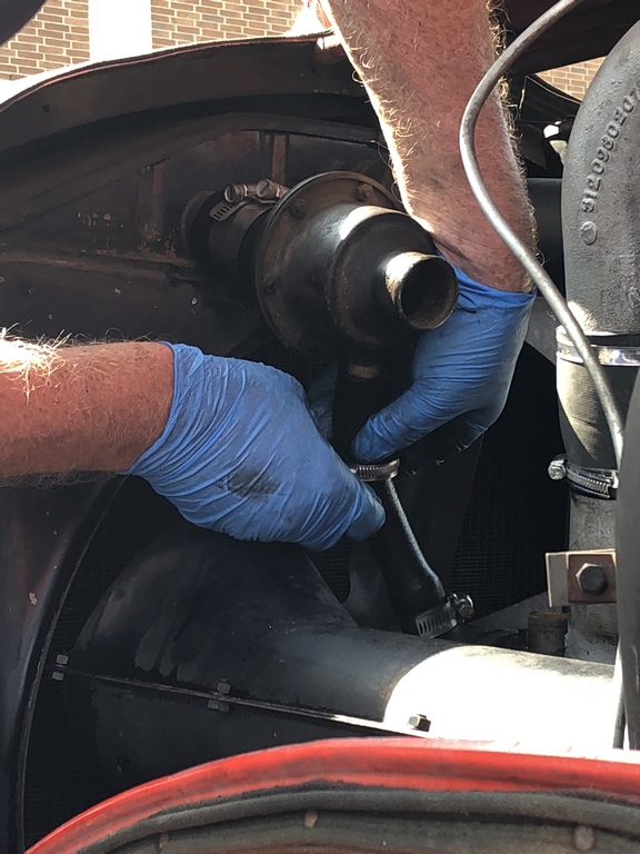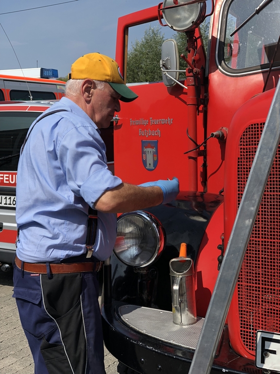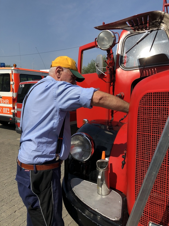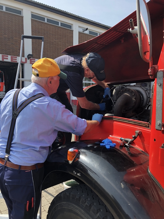 Doch als die Motorhaube des nun in seinem 62. Lebensjahr befindlichen Fahrzeugs geöffnet wurde und auch die beiden hauptamtlichen Gerätewarte einen Blick rein warfen, wurde klar, dass ein bisschen mehr Arbeit fällig werden würde. So wurde festgestellt, dass diverse Kühlschläuche porös geworden waren und besser getauscht werden sollten, denn schließlich soll die Freude an dem Fahrzeug noch lange währen.