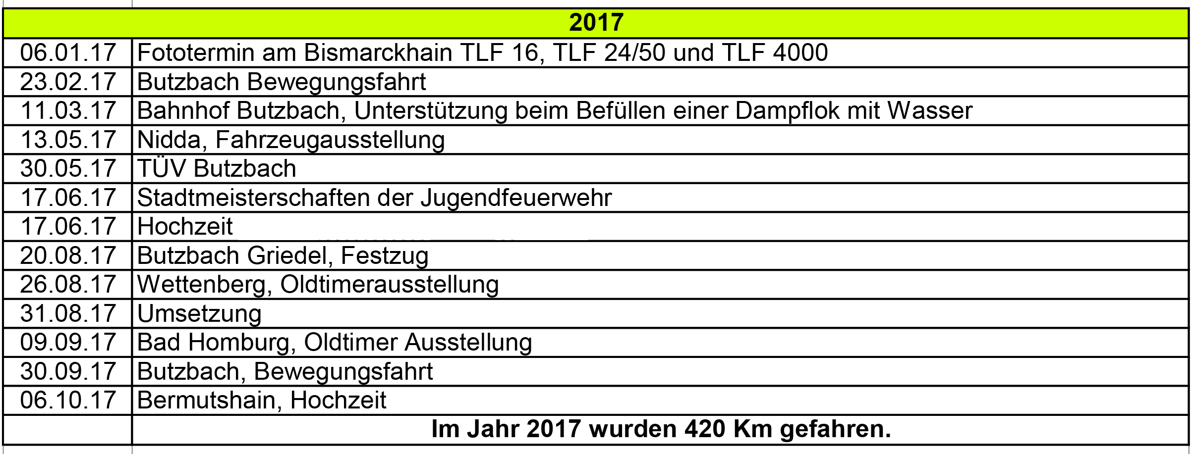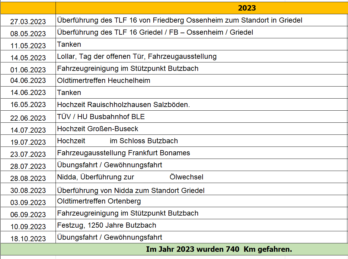 14.05.2023 Lollar – Tag der offenen Tür 04.06.2023 Oldtimertreffen Heuchelheim 16.05.2023 Hochzeitstaxi in Rauischholzhausen 14.07.2023 FF Kirch-Göns rettet „Hochzeitstaxi“ 23.07.2023 „Hansemil“ in Bonames 03.09.2023 Oldtimertreffen in Ortenberg 10.09.2023 Festumzug 1250-Jahre Butzbach 28.11.2023 Abschlusstreffen Oldtimerfreunde in Fulda