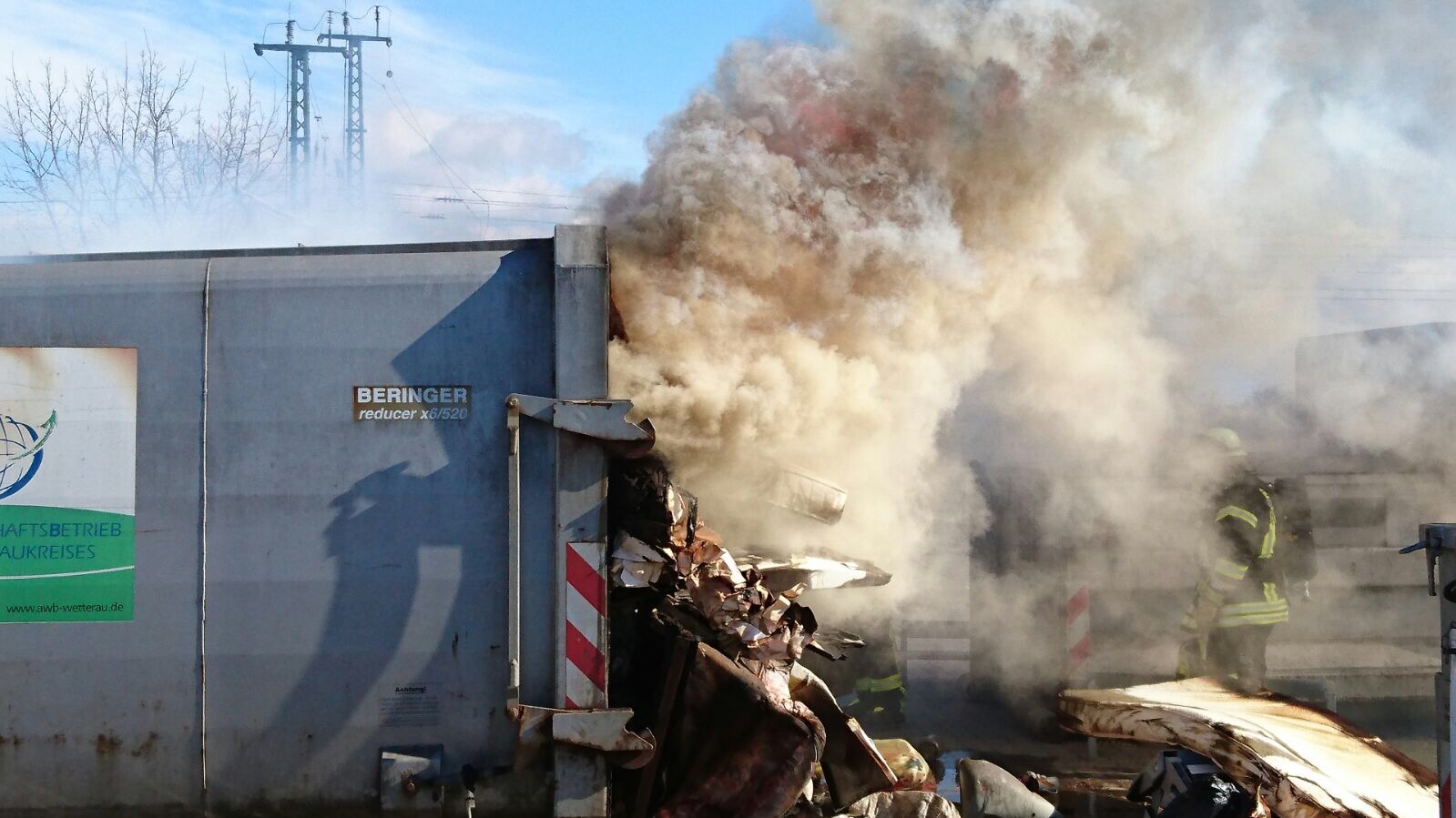 Bei Eintreffen der Einsatzkräfte stand die Presse im Vollbrand. Der brennende Inhalt wurde mit Hilfe eines Baggers ausgekippt und von der Feuerwehr abgelöscht.